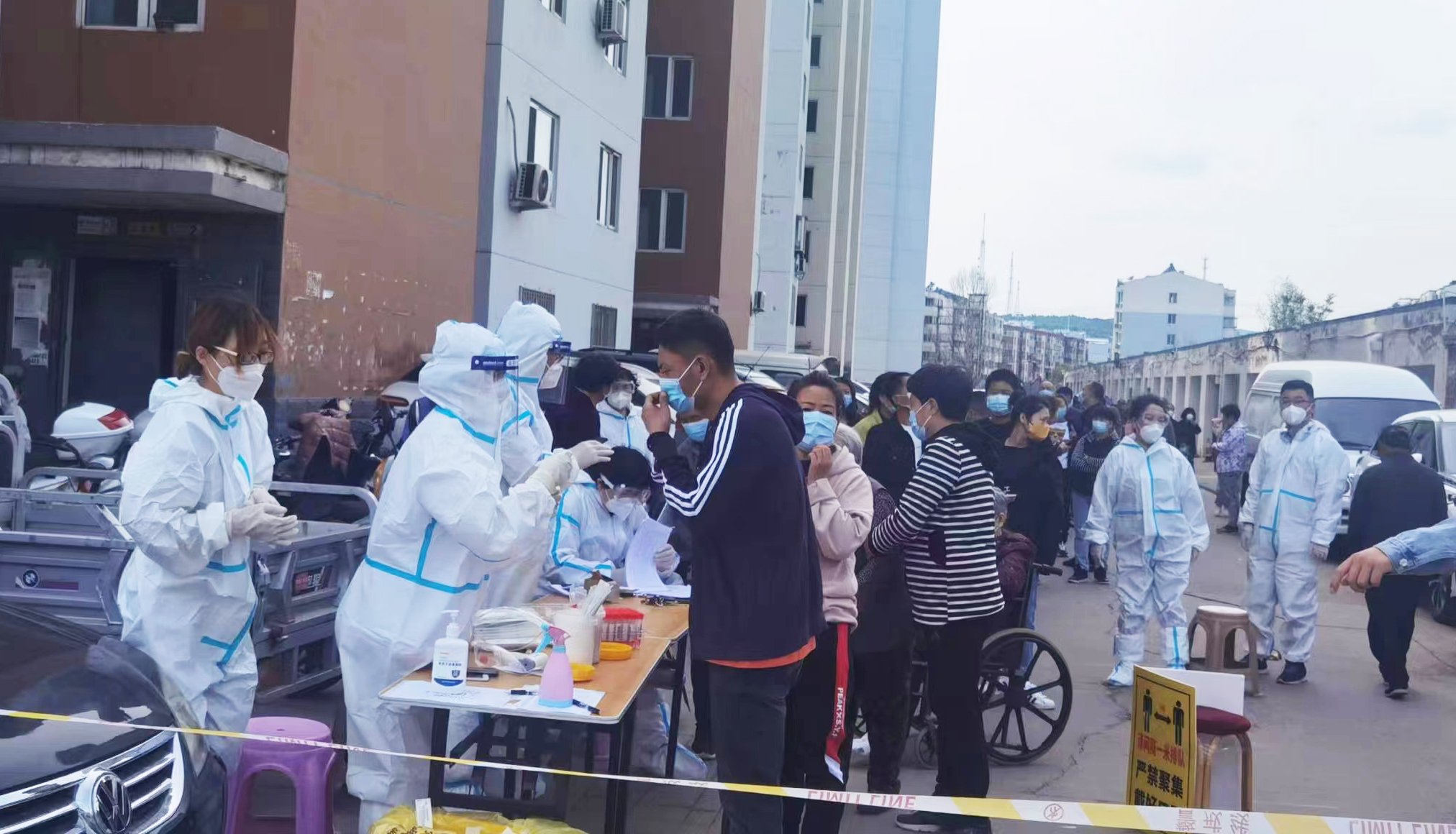 “穿上防護(hù)服成為‘大白’,感到非常光榮,也感到責(zé)任重大?!苯诔械職鉁厣?,集團(tuán)公司許平凡、紀(jì)哲負(fù)責(zé)維護(hù)秩序、信息錄入,每天穿著密不透風(fēng)的防護(hù)服、戴著醫(yī)用口罩及手套,里面衣服被汗水浸透,手被捂得發(fā)白,鼻梁被口罩壓出瘀痕,平時(shí)顯得厚實(shí)的腳套,每天都被磨破兩三雙,一刻不停的指揮居民排隊(duì),逐樓的通知居民下樓核酸,嗓子都喊啞了,也從沒(méi)有喊過(guò)累。